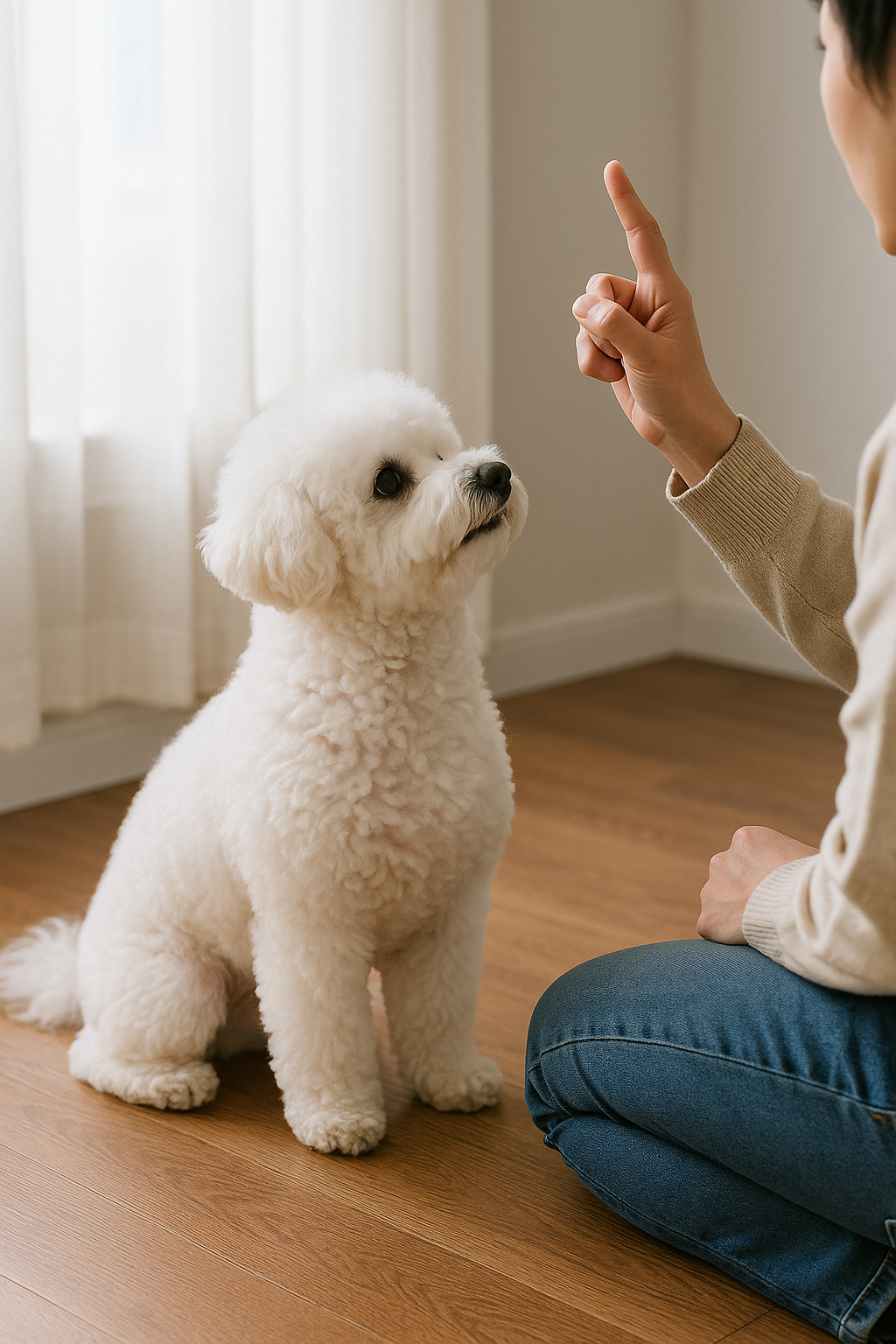 - 가장 쉬운 ‘앉아’부터 시작해 보세요. 간식을 들고 머리 위로 올리면 자연스럽게 앉게 되는데, 그때 “앉아!”라고 말하며 보상합니다.