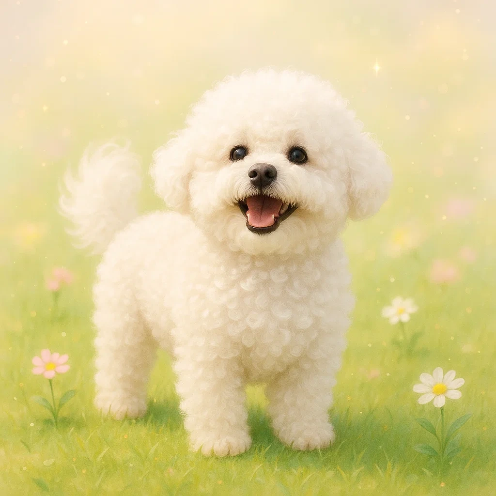 비숑 프리제는 프랑스와 벨기에에서 유래한 작고 귀여운 소형견으로, 하얗고 곱슬곱슬한 털과 반짝이는 눈을 가진 사랑스러운 반려견입니다. ‘곱슬거리는 털의 작은 개’라는 의미처럼 봉제 인형을 연상시키는 외모로 많은 이들의 사랑을 받고 있습니다.